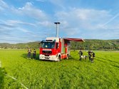 Vor dem Einrücken wurde das gesamte Brandgut abschließend mit dem Frontmonitor des Hilfeleistungsfahrzeugs 3 (HLF 3) mittels Löschwasser benetzt.