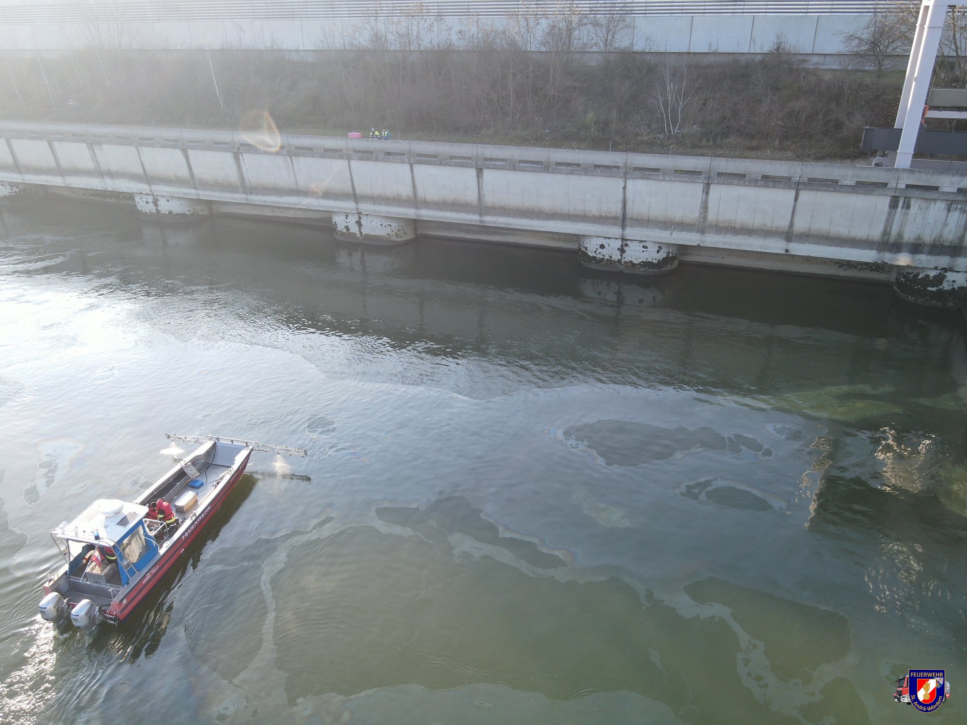 Zur großflächigen Ausleuchtung der Einsatzstelle wurde die Drehleiter in Stellung gebracht. Da der Verdacht bestand, dass der Ölaustritt von einer Turbine ausging, wurde eine Dammwand mithilfe eines Portalkrans zur Hälfte ins Wasser gelassen und zwischen der Dammwand und der Kraftwerkswand auf einer Länge von etwa zehn Metern selbstsaugende Ölsperren installiert.