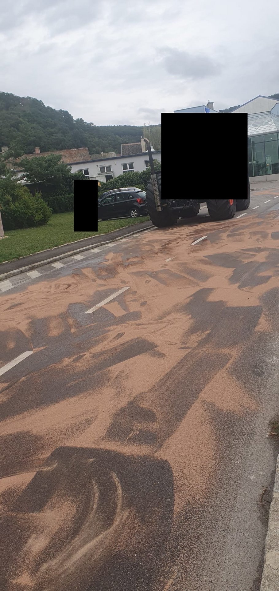 Aus noch ungeklärter Ursache trat an einem Traktor eine nicht genau bezifferbare Menge Hydrauliköl aus und verunreinigte mehrere Meter der Fahrbahn.