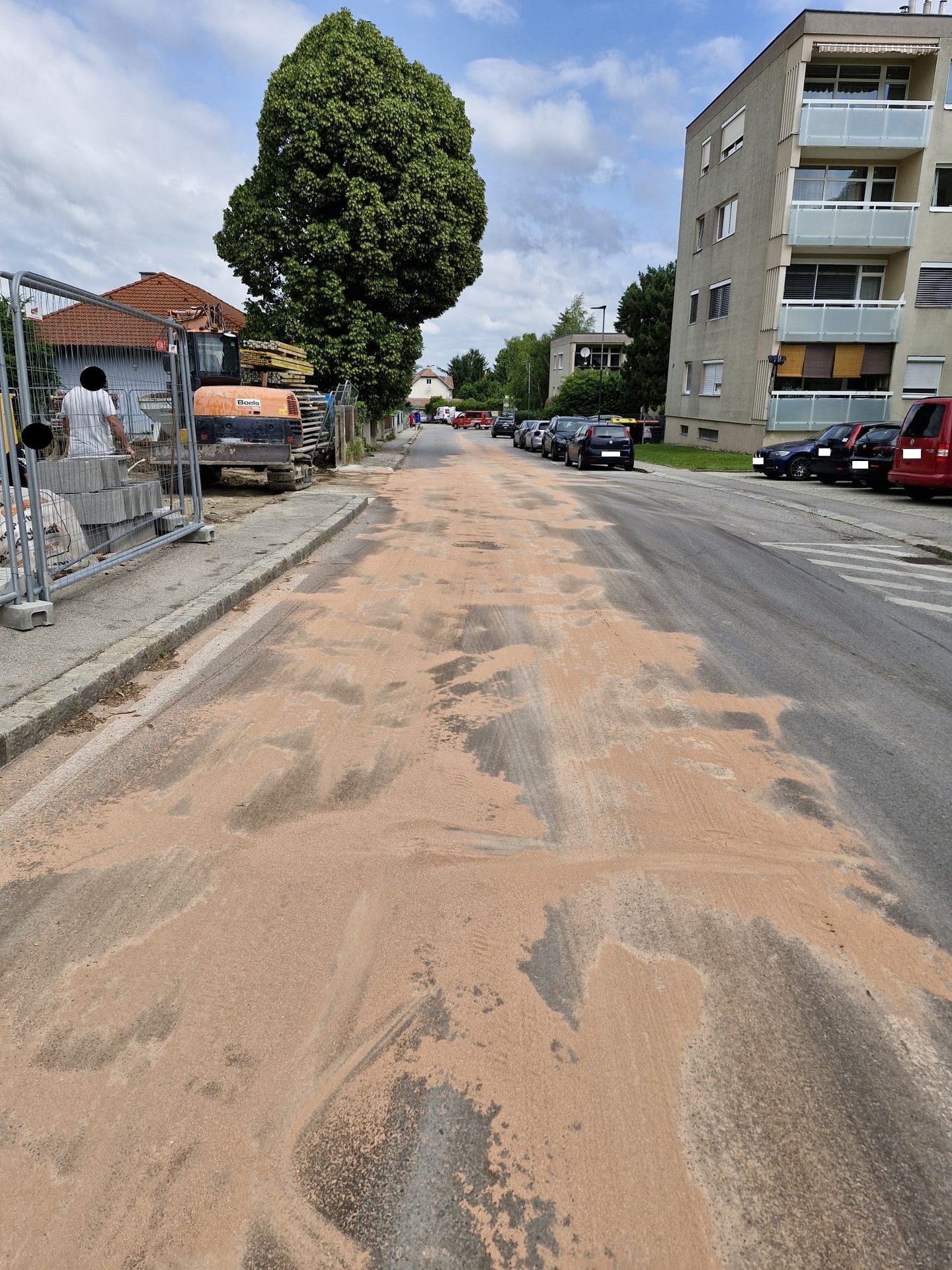 Die an der Fahrbahn haftenden Schadstoffe wurden mittels Ölbindemittel gebunden und anschließend durch die Kehrmaschine der Firma Karner abgesaugt. In weiterer Folge wurde ein ökologisches Netzmittel aufgetragen und durch die Kehrmaschine eingearbeitet.