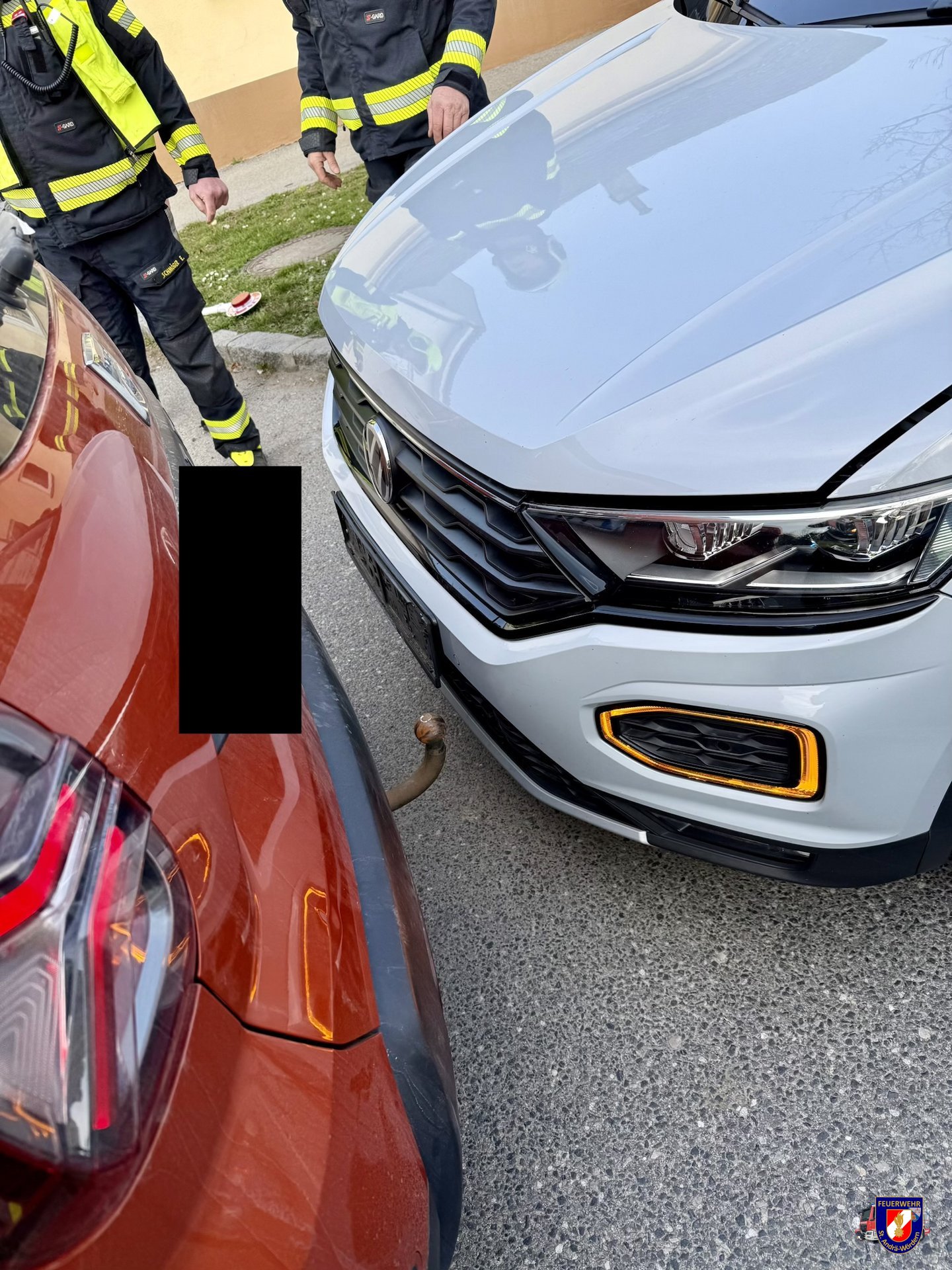 Aus unbekannter Ursache kam es zur Kollision zweier Fahrzeuge, wobei sich das eine Fahrzeug in der Folge in der Anhängevorrichtung des anderen Fahrzeugs verfing.