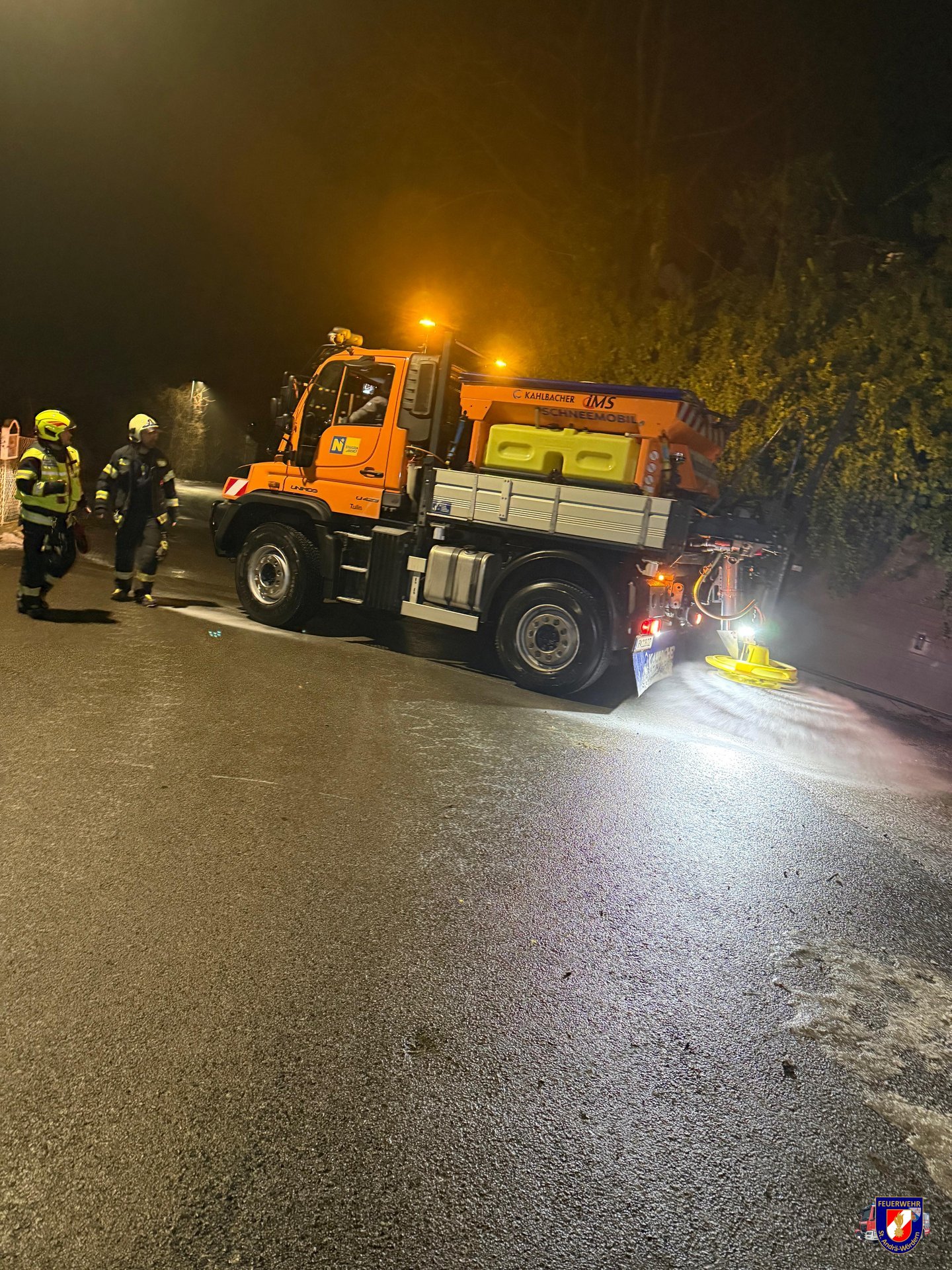 Anschließend konnte der eigentliche Einsatzort erreicht werden. Aufgrund der prekären Rutschgefahr durch die Eisschicht wurde auf das Eintreffen des Straßendienstes der Straßenmeisterei abgewartet. Dieser benetzte die Straße im erforderlichen Maße mit einer Salzwasserlösung, um die Glätte zu bekämpfen.