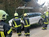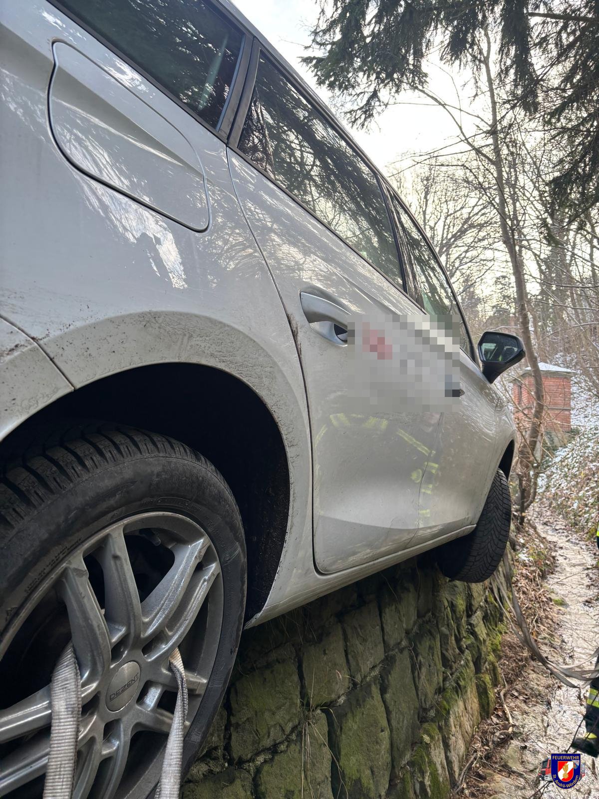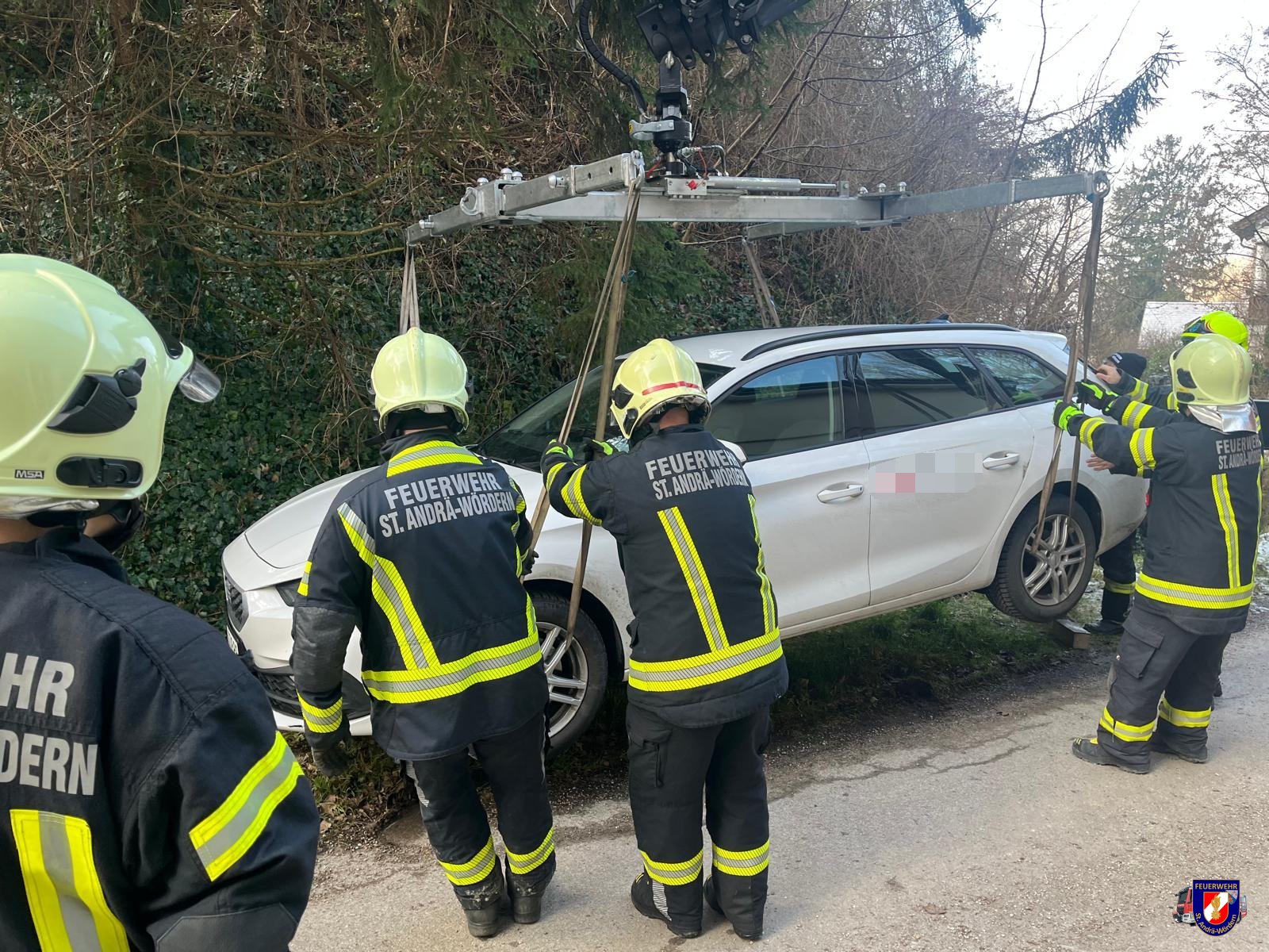 Im Rahmen des Ausparkens geriet das Fahrzeug seitlich in den Straßengraben. Mittels Kran und Hebekreuz des schweren Rüstfahrzeuges (SRF) konnte das Fahrzeug behutsam angehoben und anschließend zurück auf die Fahrbahn verbracht werden.