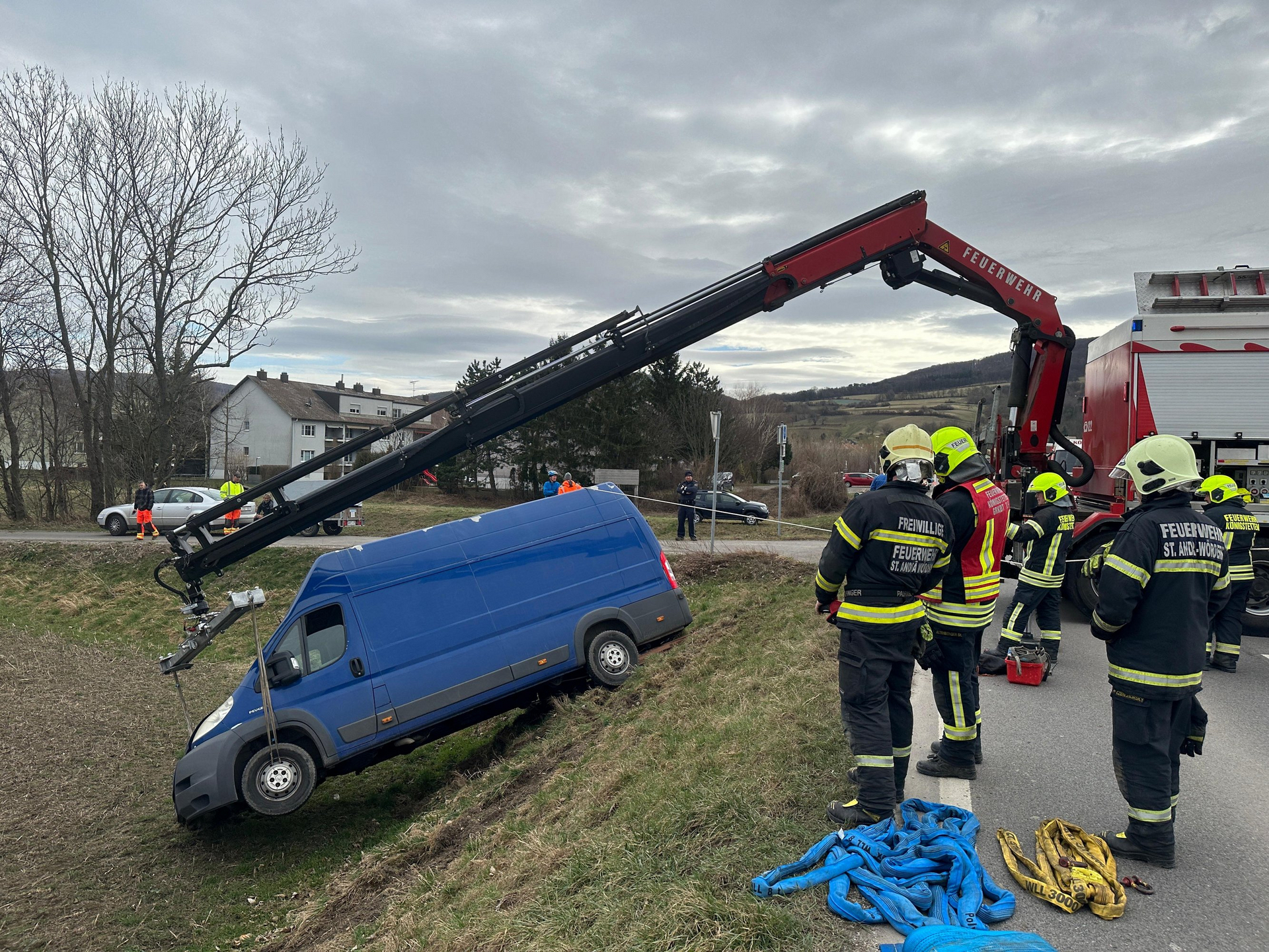 Mittels Ladekran des schweren Rüstfahrzeuges (SRF) wurde das Fahrzeug im vorderen Teil angehoben. Zur gleichen Zeit wurde die Seilwinde des Tanklöschfahrzeuges (TLF-A) der Feuerwehr Königstetten mit dem Unfallfahrzeug verbunden. Unter gemeinsamer gegenseitiger Abstimmung wurde der Wagen wieder zurück auf die Fahrbahn verbracht und anschließend an einem gesicherten Ort abgestellt.