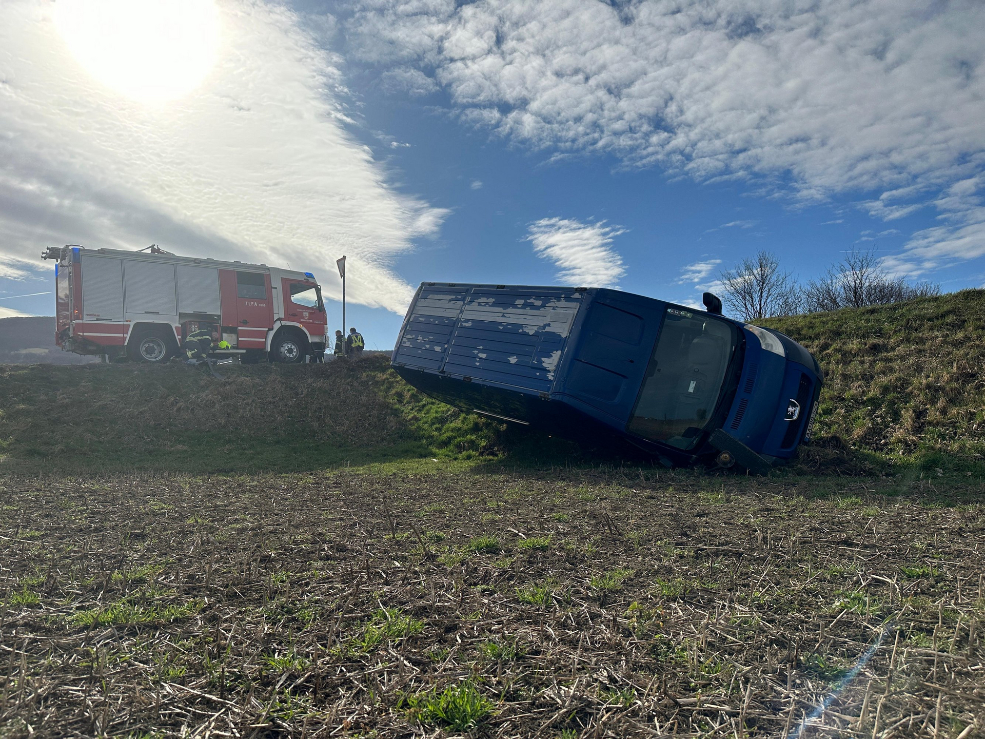 Aus ungeklärter Ursache kam im Bereich der Landesstraße L120 ein Kleinlastkraftwagen von der Fahrbahn ab und rutschte einen Hang hinab.