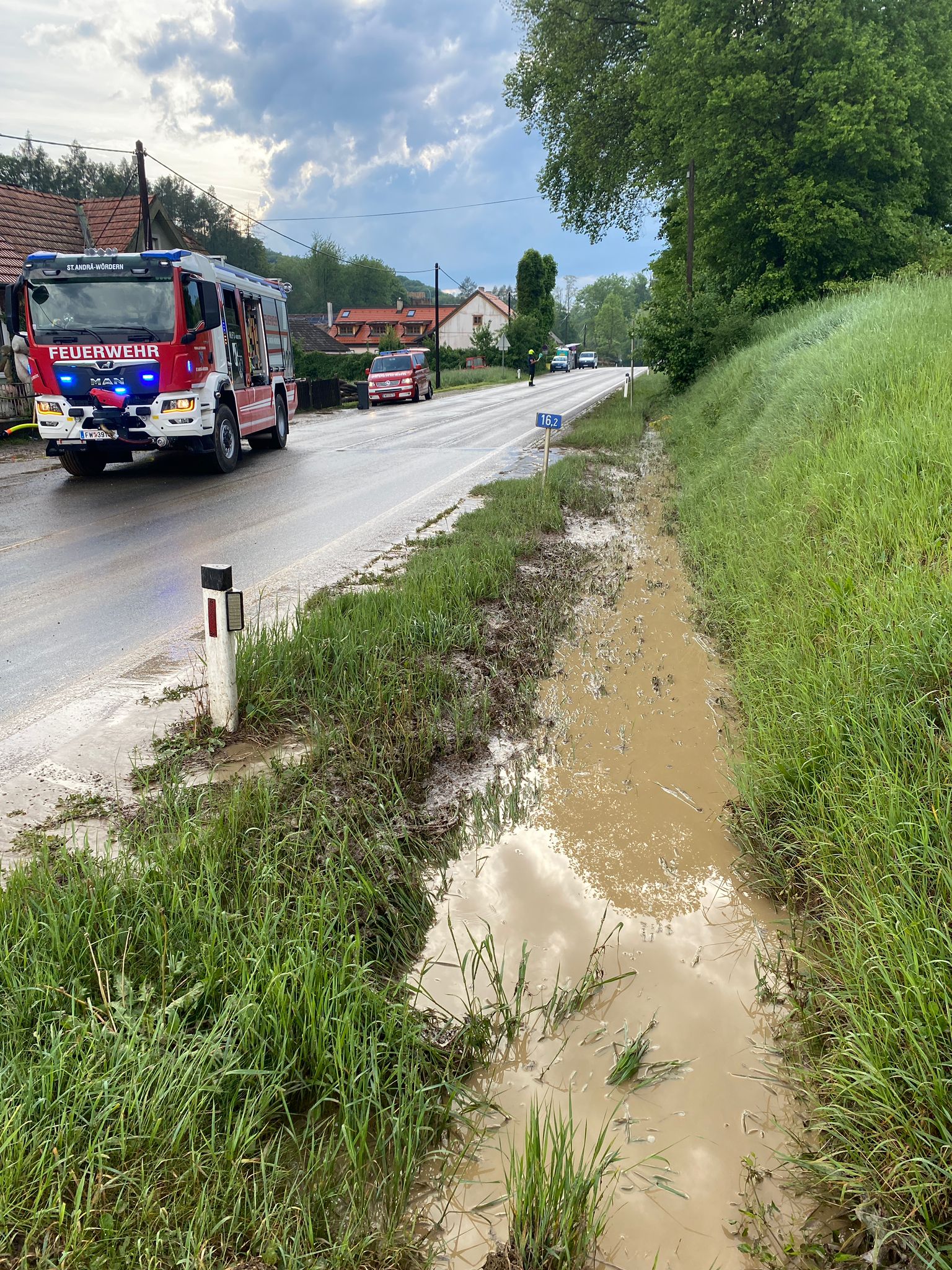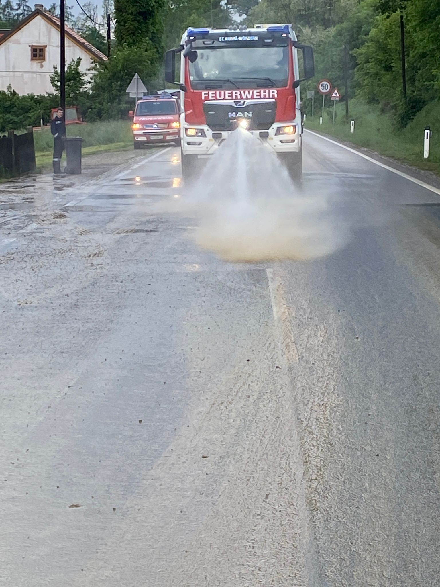 Gegen 17:36 Uhr wurde die Feuerwehr St. Andrä-Wördern im Bereich der Wiener Straße zu einem Einsatz beordert. Schlammmassen verschmutzten Teile der Fahrbahn und einen daneben befindlichen Garten. Mittels Schnellangriff und Frontmonitor des Hilfeleistungslöschfahrzeugs (HLF3) konnten die Verunreinigungen in kürzester Zeit entfernt werden.