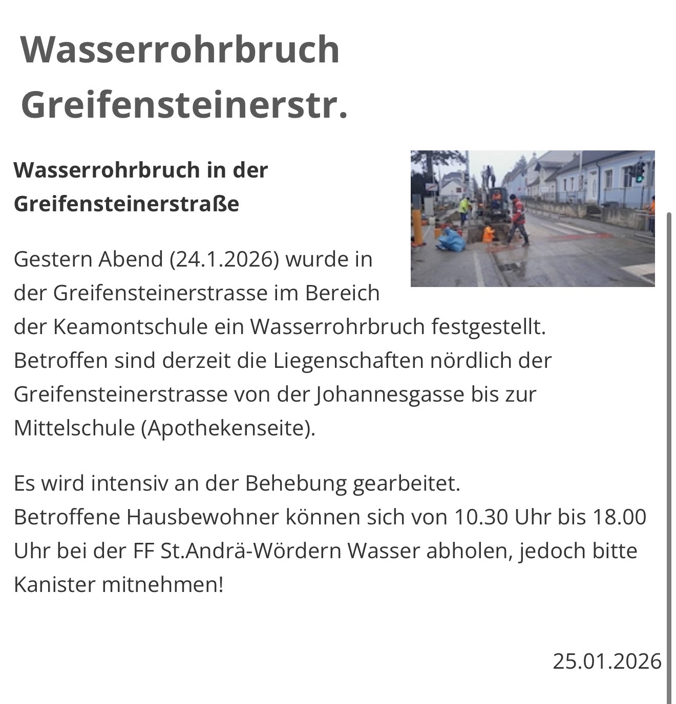 Zwischen 10:30 Uhr und 18:00 Uhr besteht für die betroffenen Haushalte die Möglichkeit, bei der örtlich zuständigen Feuerwehr St. Andrä-Wördern Trink- und Brauchwasser abzuholen. Bitte bringen Sie einen Kanister mit. Die Einsatzkräfte versehen im abwechselnden Schema Dienst und stehen der Bevölkerung unterstützend zur Seite. Wie an jedem Tag sind wir auch heute für unsere Bevölkerung einsatzbereit.