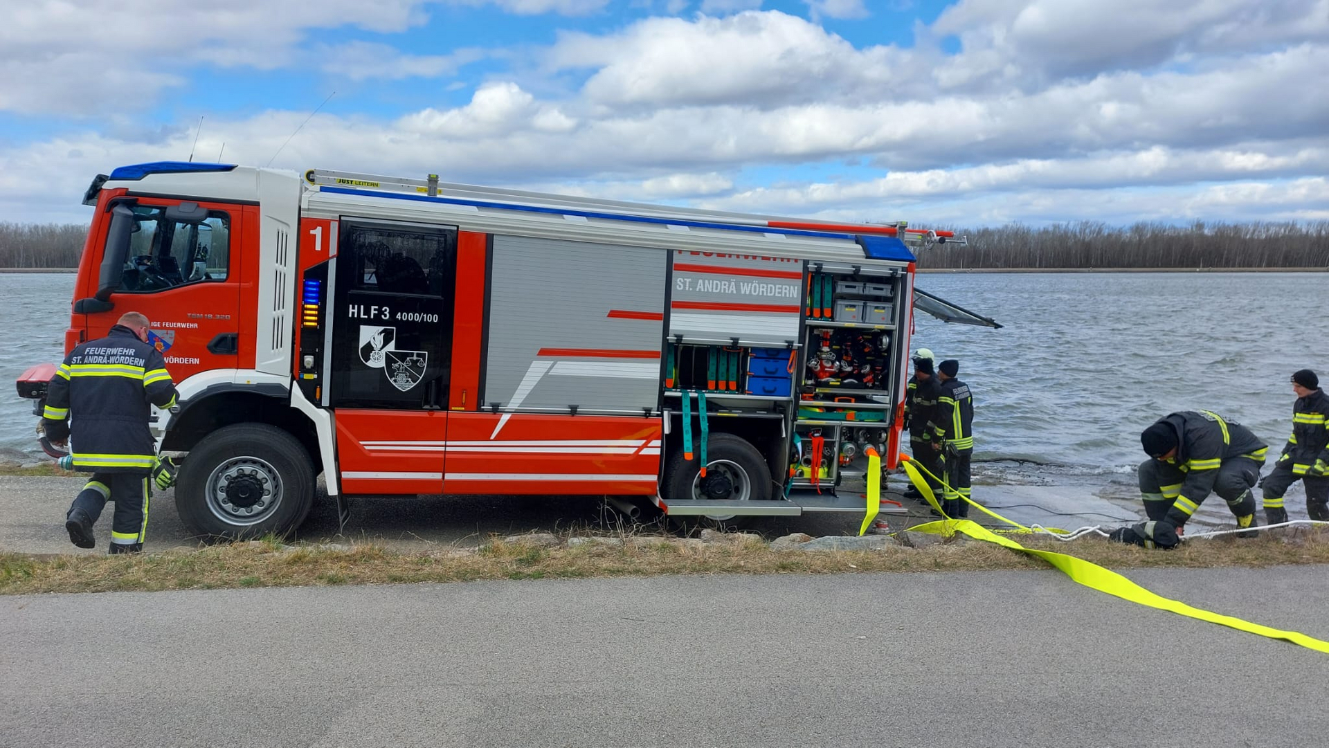 Nach einer technischen Übung im Depot mittels der am Fahrzeug befindlichen akkubetriebenen Geräte gab es ein gemeinsames Mittagessen. Danach ging es mit allen Kameraden an die Donau. Dort angekommen, konnten alle wasserführenden Geräte, wie zum Beispiel mobiler Wasserwerfer etc. vom neuen HLF3 erprobt werden.