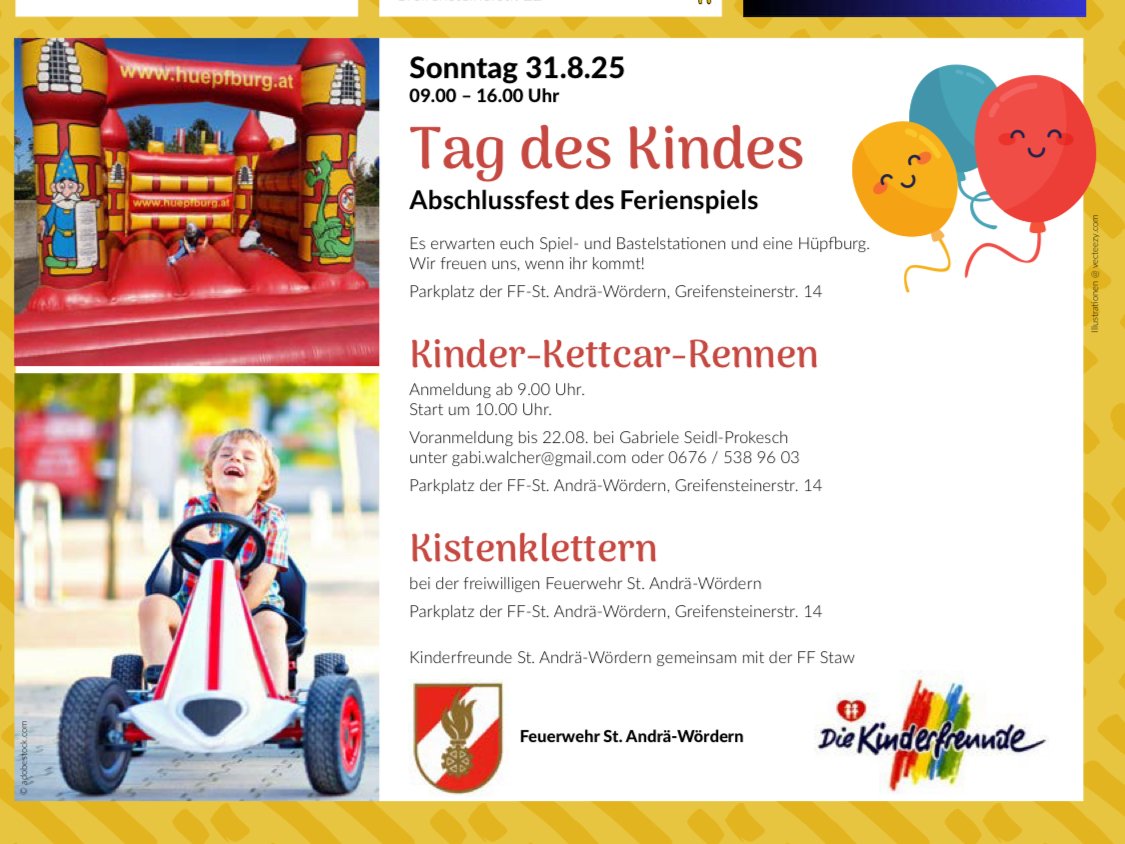 Am 31. August ab 10:00 Uhr findet das Abschlussfest des Ferienspiels bei der Feuerwehr St. Andrä-Wördern statt.