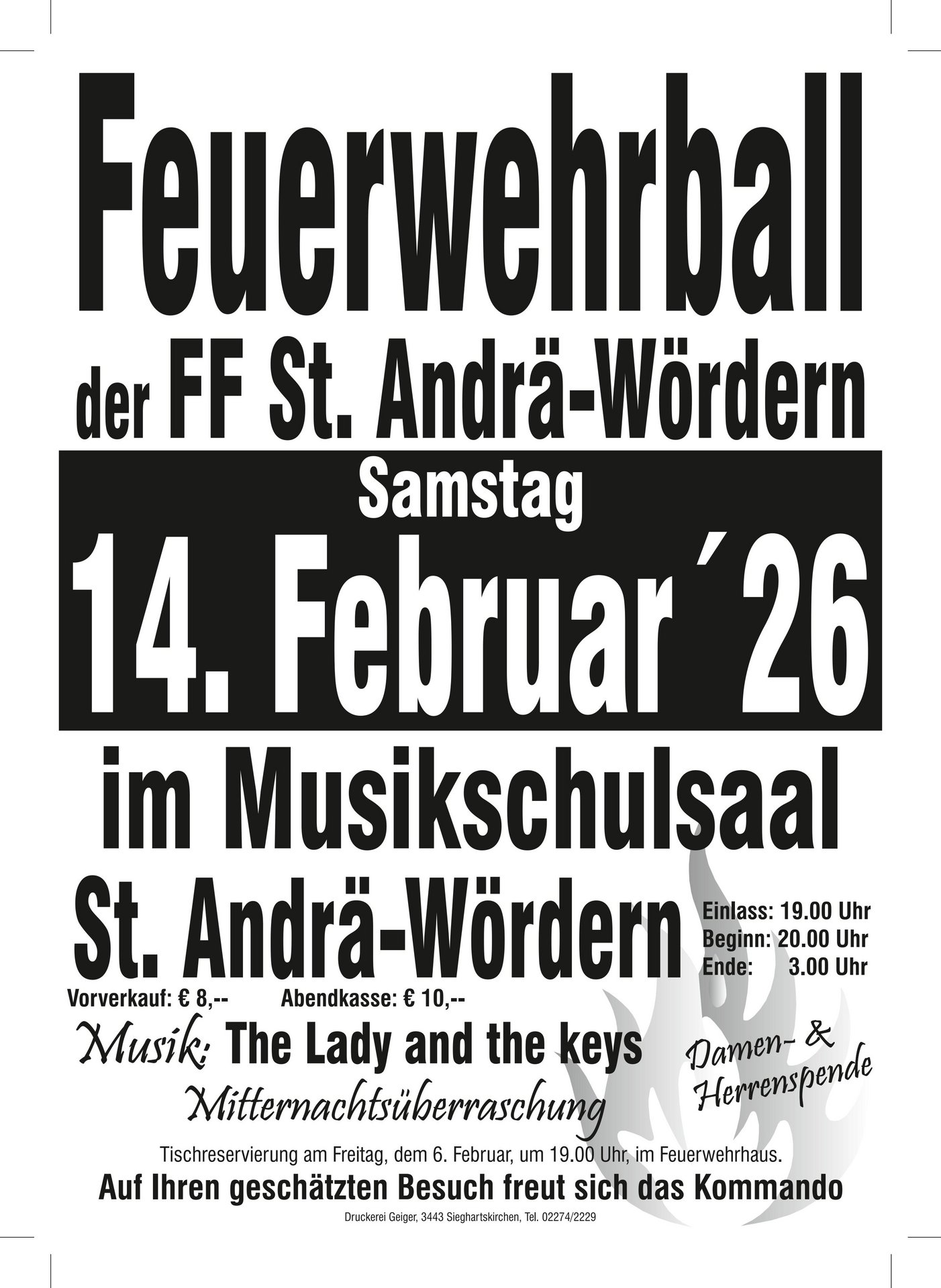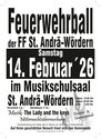 Die freiwillige Feuerwehr St. Andrä-Wördern lädt zum diesjährigen Feuerwehrball am Samstag, dem 14. Februar 2026 im Musikschulsaal ein.
