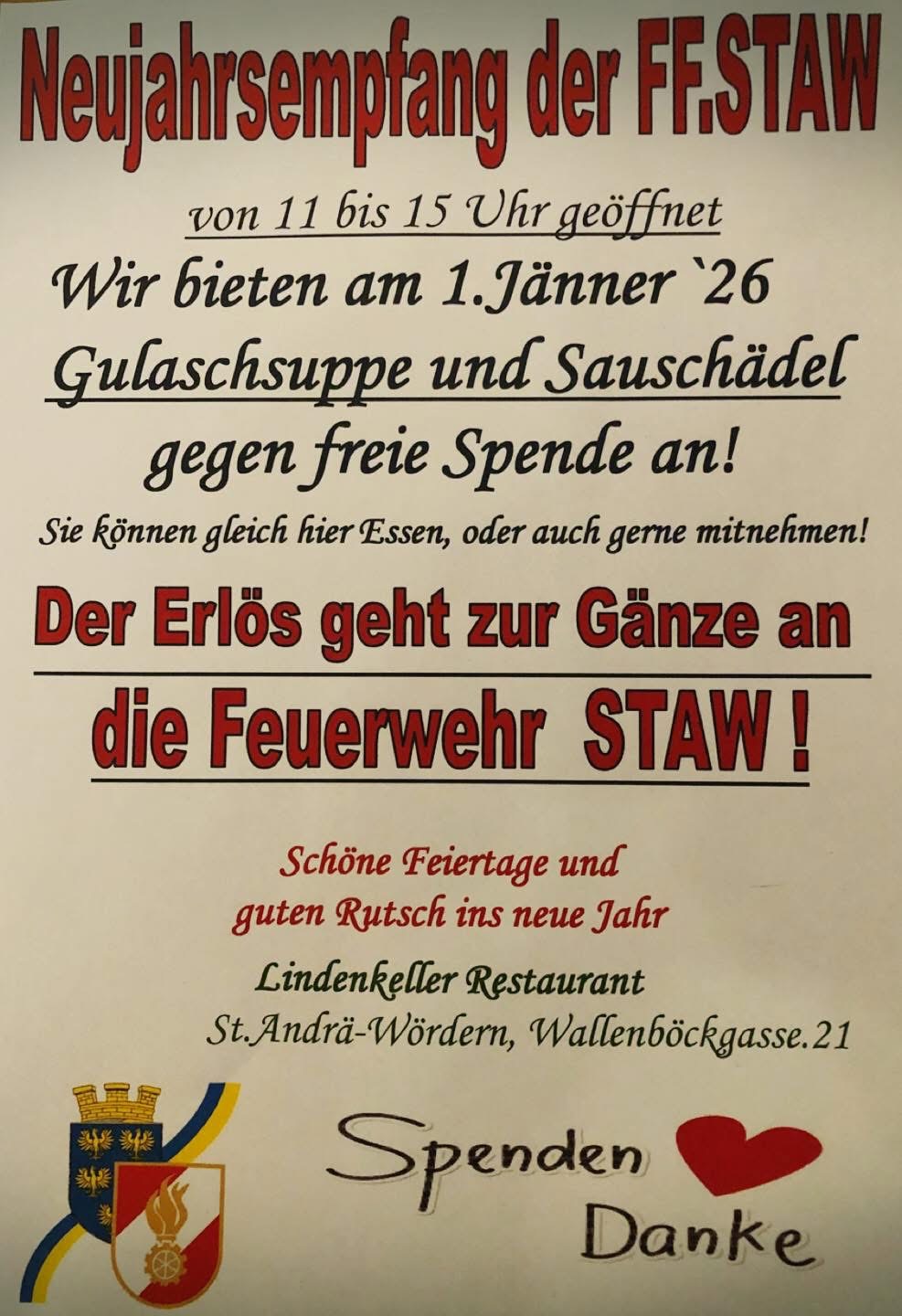 Am 01. Jänner 2026 hält das Lindenkeller-Restaurant den traditionellen Neujahrsempfang für unsere Feuerwehr ab. Gegen eine freie Spende können sie sich eine leckere Gulaschsuppe oder einen Sauschädel schmecken lassen.