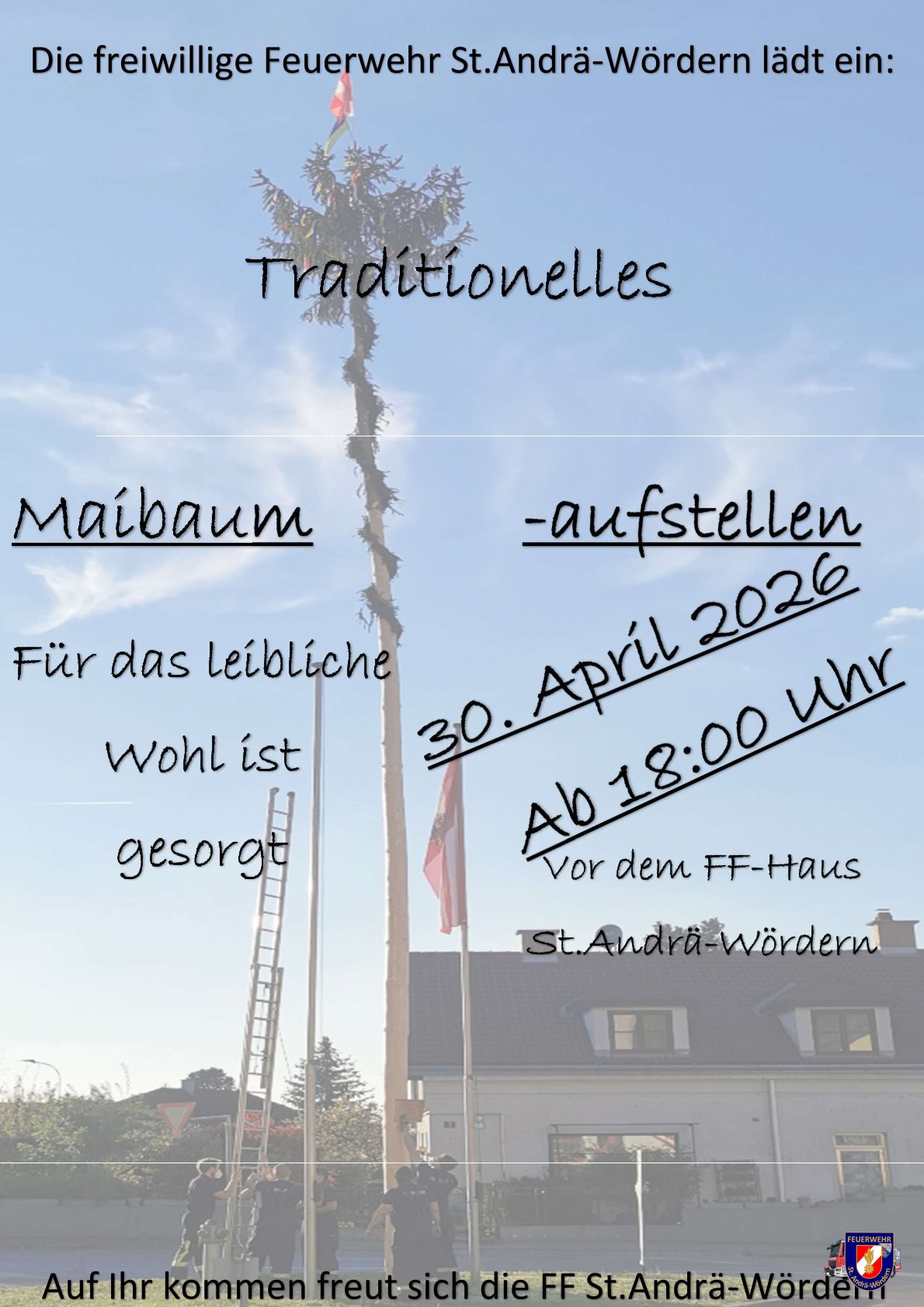 Der Abend startet wie immer um 18:00 Uhr mit dem Maibaumaufstellen vor dem Feuerwehrhaus St. Andrä-Wördern. Für Essen und Trinken ist natürlich gesorgt, damit niemand hungrig oder durstig bleibt.