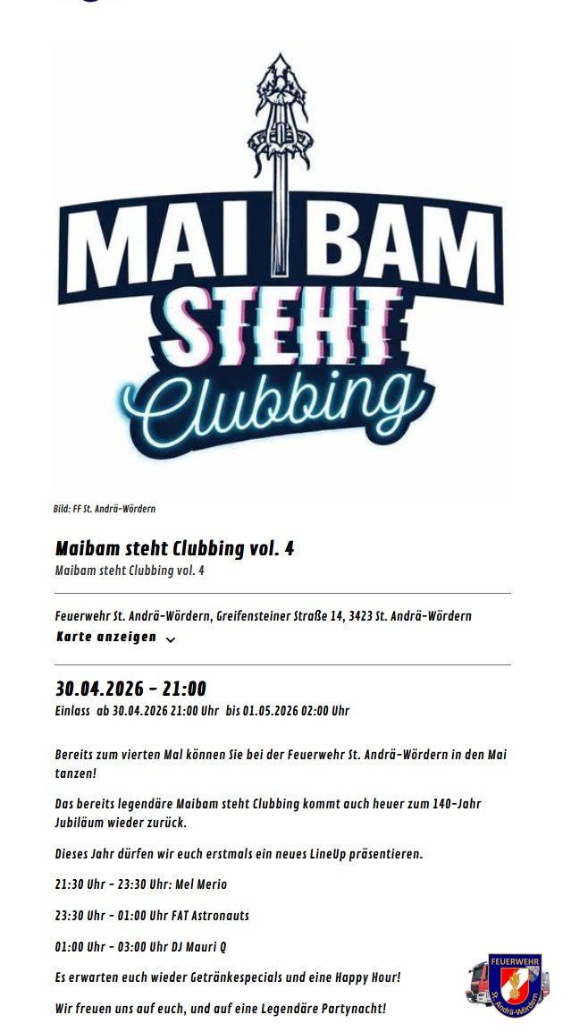 Schon zum vierten Mal könnt ihr bei der Feuerwehr St. Andrä-Wördern in den Mai tanzen!