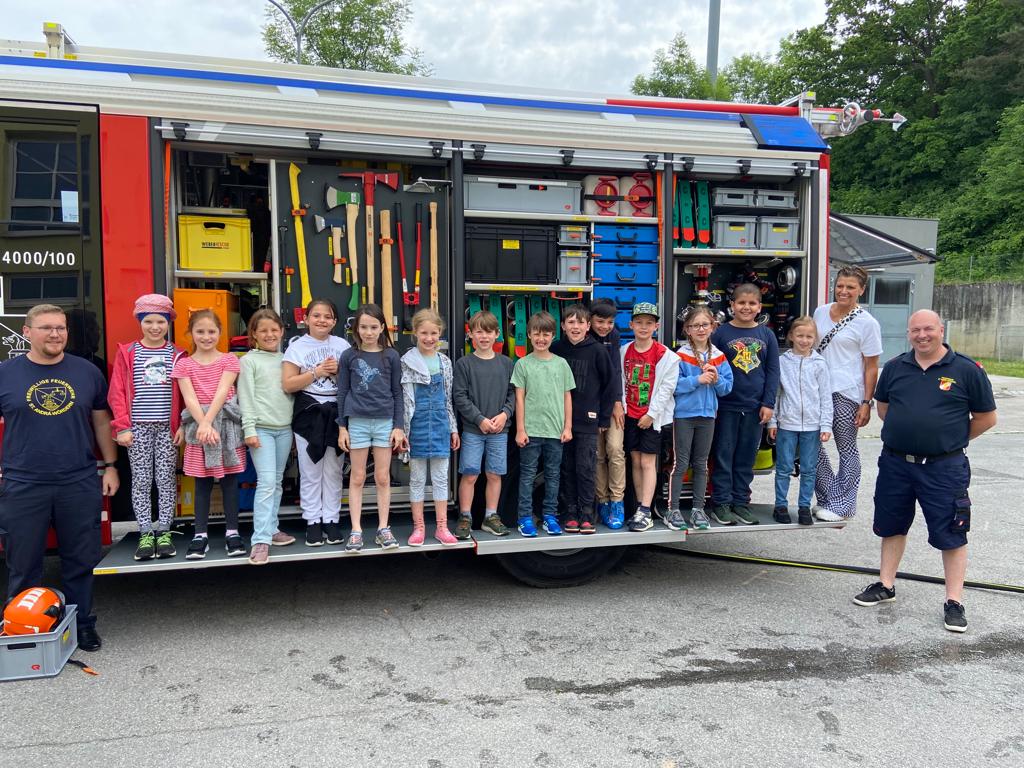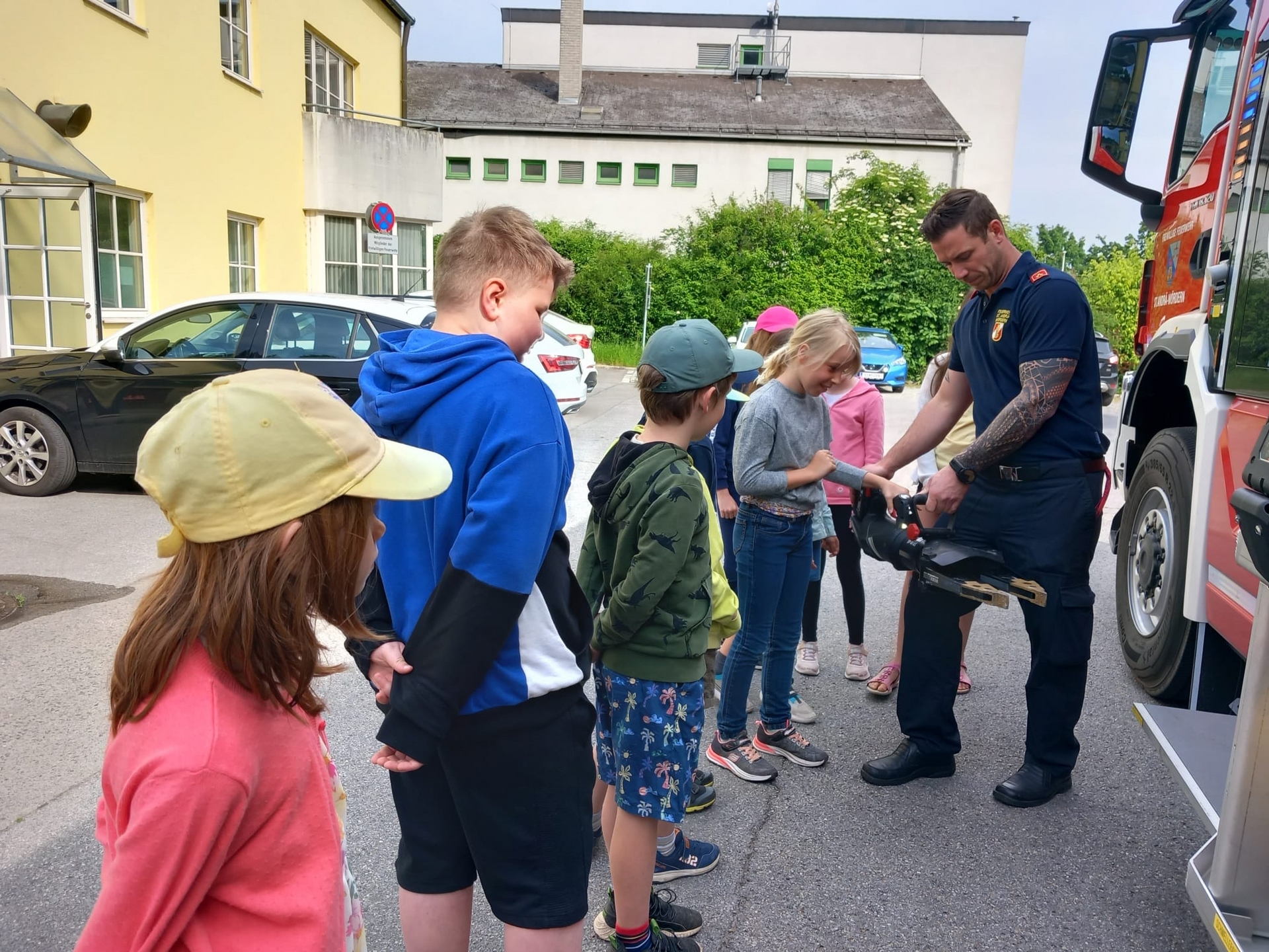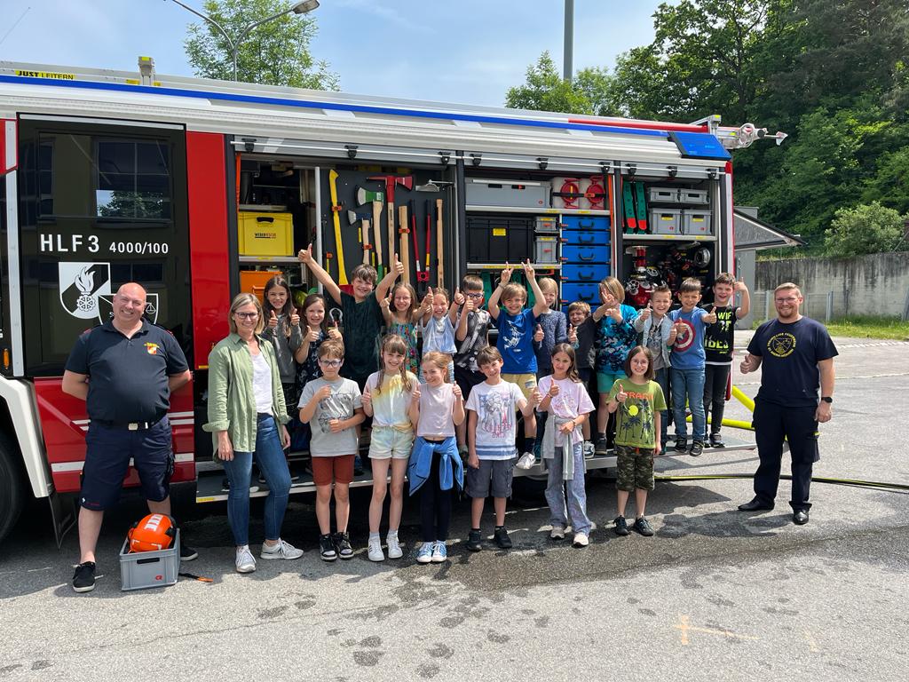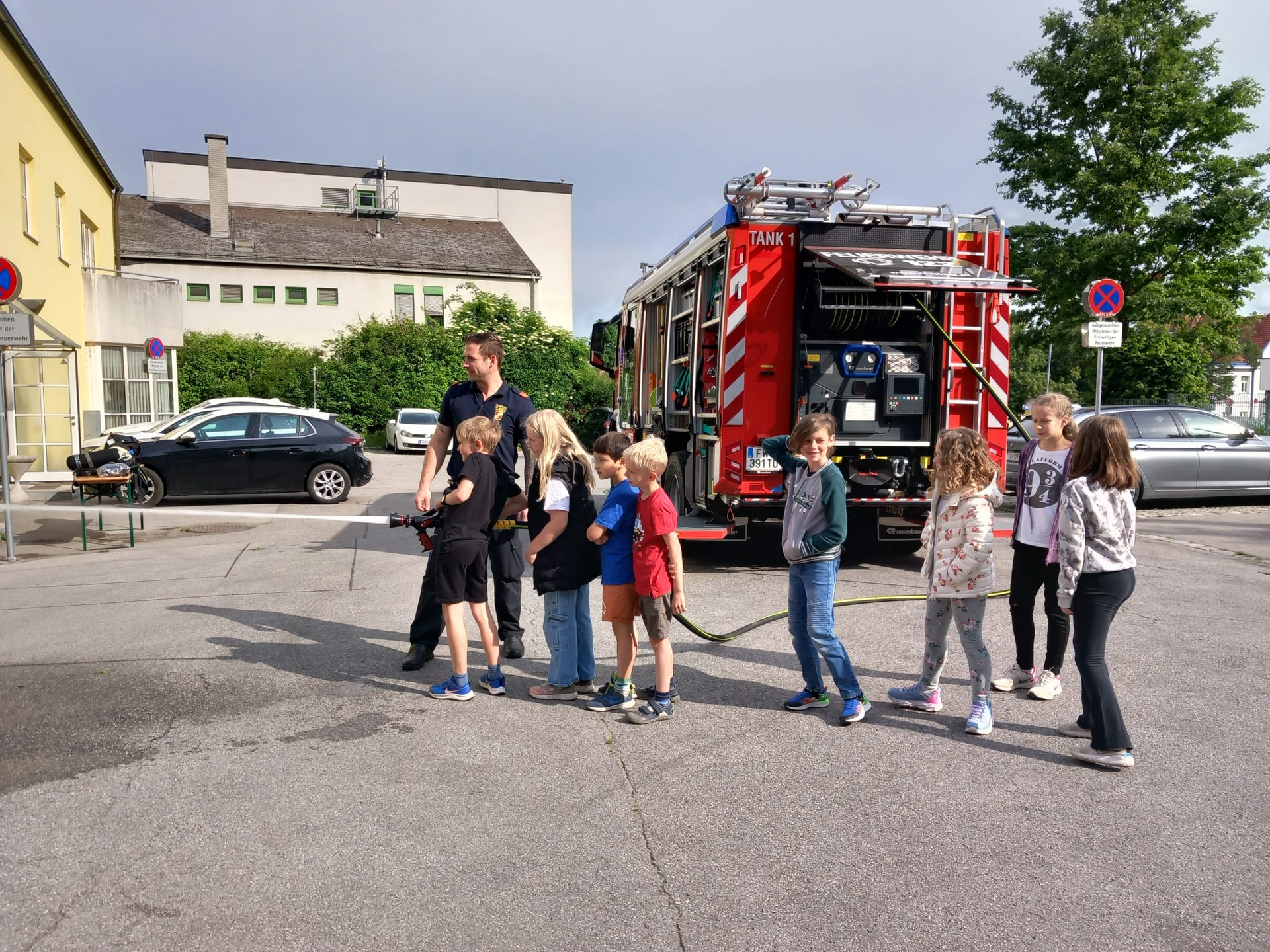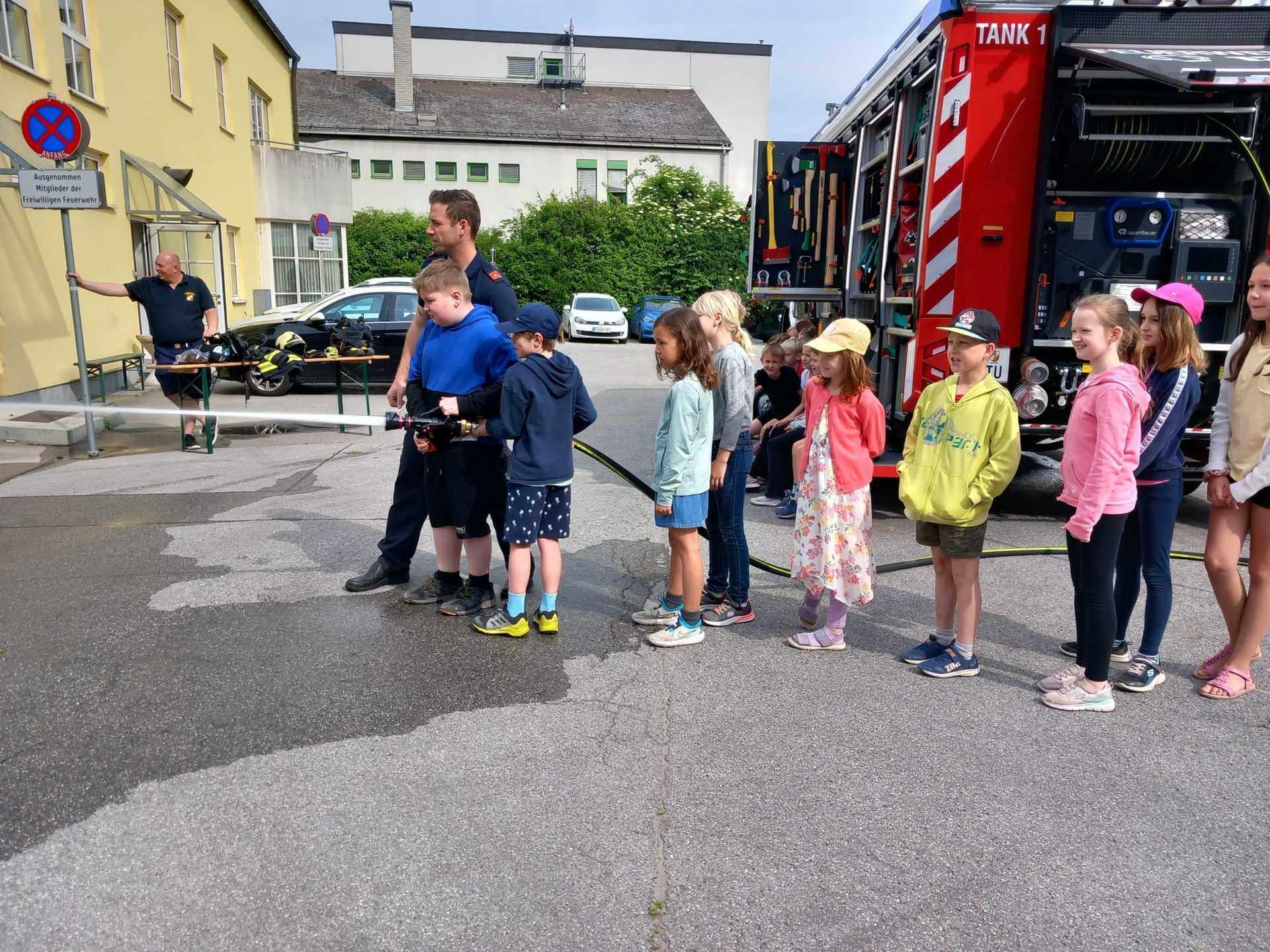 Zu Beginn erhielten die Schüler/innen eine interessante Führung durch die Feuerwehr. Danach ging es zum spaßigen Teil über. Das neue Hilfeleistungslöschfahrzeug wurde in Position gestellt und demonstrierte den Wasserwerfer. Auch wurde die Beladung erklärt. Anschließend konnten die Schüler mittels Strahlrohr einmal ein(e) "echte(r) Feuerwehrmann/frau" sein. Weiters wurden durch unseren Jugendführer die Kinder über die Jugendfeuerwehr aufgeklärt.